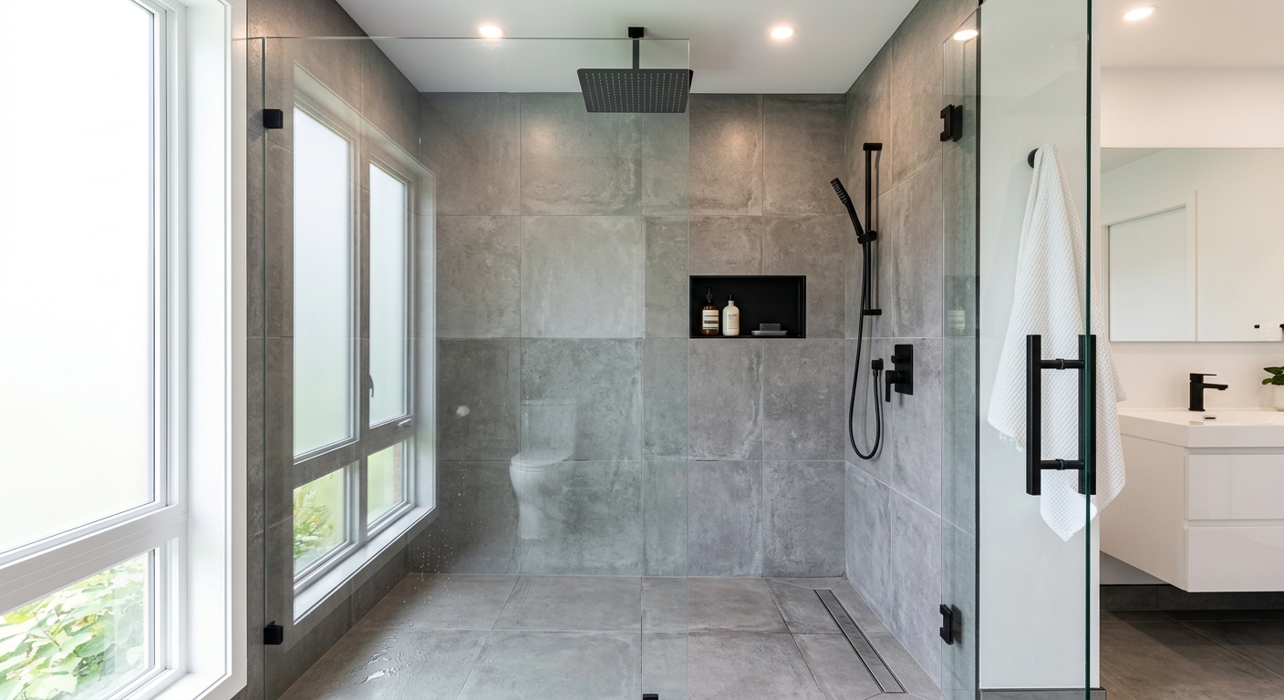 Installation de douche sans rebord avec carrelage sur mesure à Saint-Thomas.